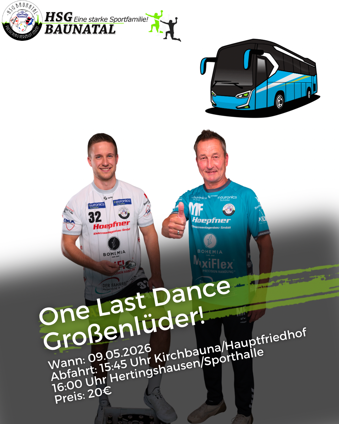 Baunatal - Zum letzten Saisonspiel bittet die 1. Männermannschaft zum "One Last Dance" in Großenlüder. Zu diesem letzten Spiel der Saison 2025/26 setzt die HSG Baunatal einen Fan-Bus ein. Wer die Mannschaft bei der HSG Großenlüder/Hainzell unterstützen- und mit ihr auf der Rückfahrt feiern möchte, egal wie das Spiel ausgeht, kann sich beim HSG-Vorstand Tobias Oschmann unter der Mobil-Nr.: 0173-5682243 anmelden.