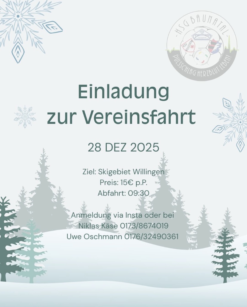 Anmeldungen werden über Instagram/HSG Baunatal oder direkt von Niklas Käse: 0173-8674019 oder von Uwe Oschmann: 0176-32490361, bis zum 01.12.2025 entgegengenommen.